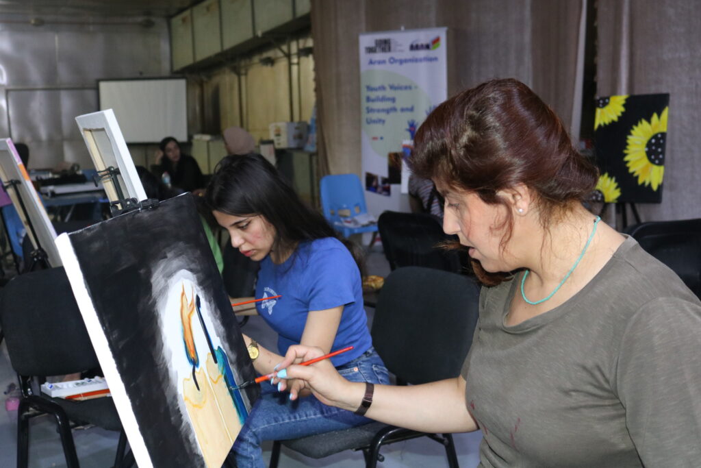 - Day 1 (June 16): Foundations of Trust and Expression. The first day was dedicated to building a safe and supportive environment. Dilpak Khdir led introductions and trust-building exercises, encouraging participants to connect with one another. The session focused on the fundamentals of emotional expression through art, exploring how different colors, textures, and strokes can represent feelings like joy, sorrow, anger, and hope. Artists began with initial sketches and conceptual brainstorming on their canvases.